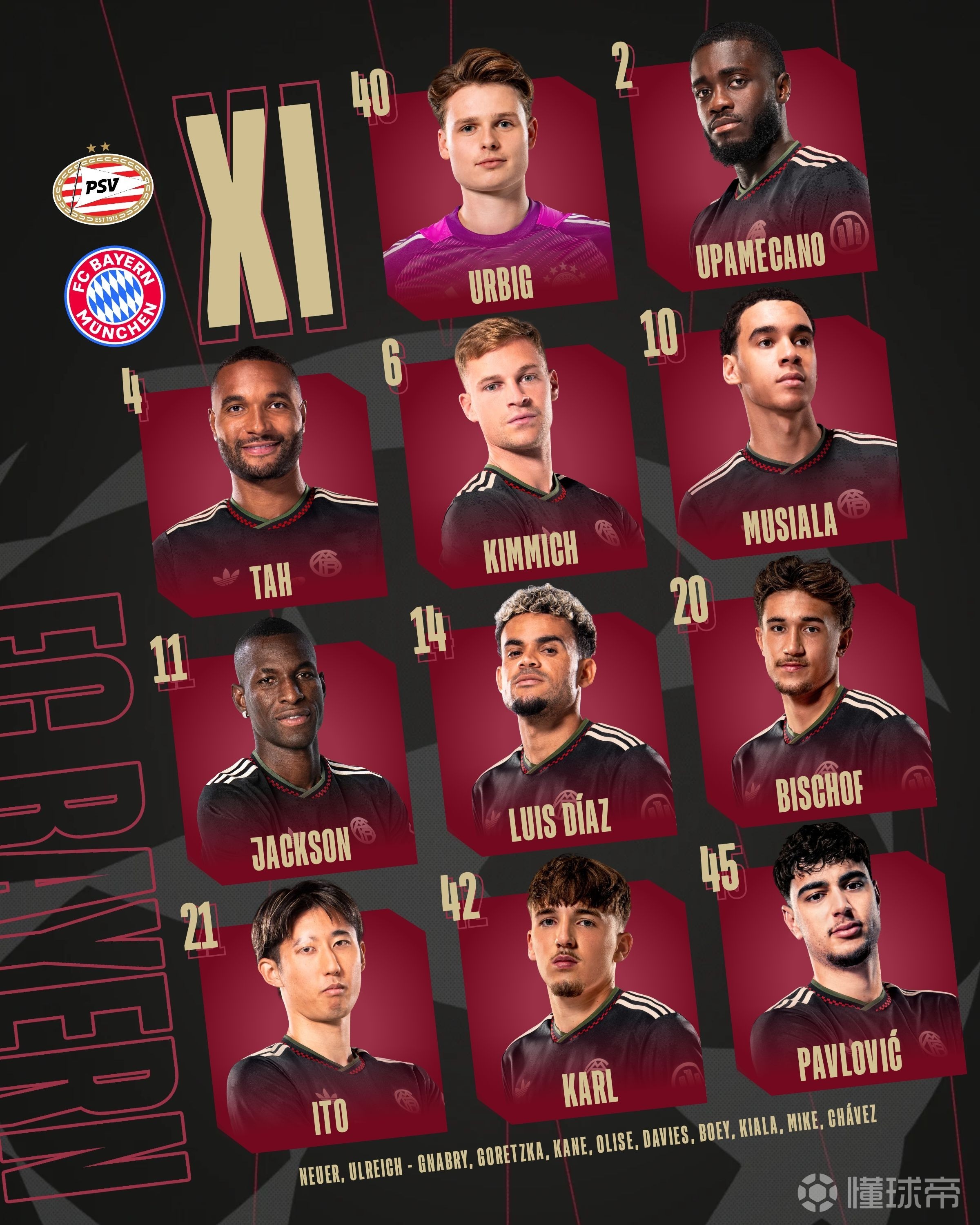 拜仁客战埃因霍温:雅克松、迪亚斯首发、卡尔、穆西亚拉出战